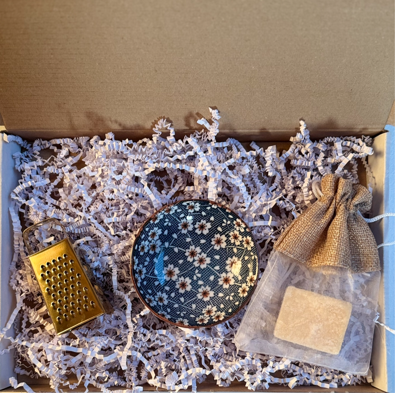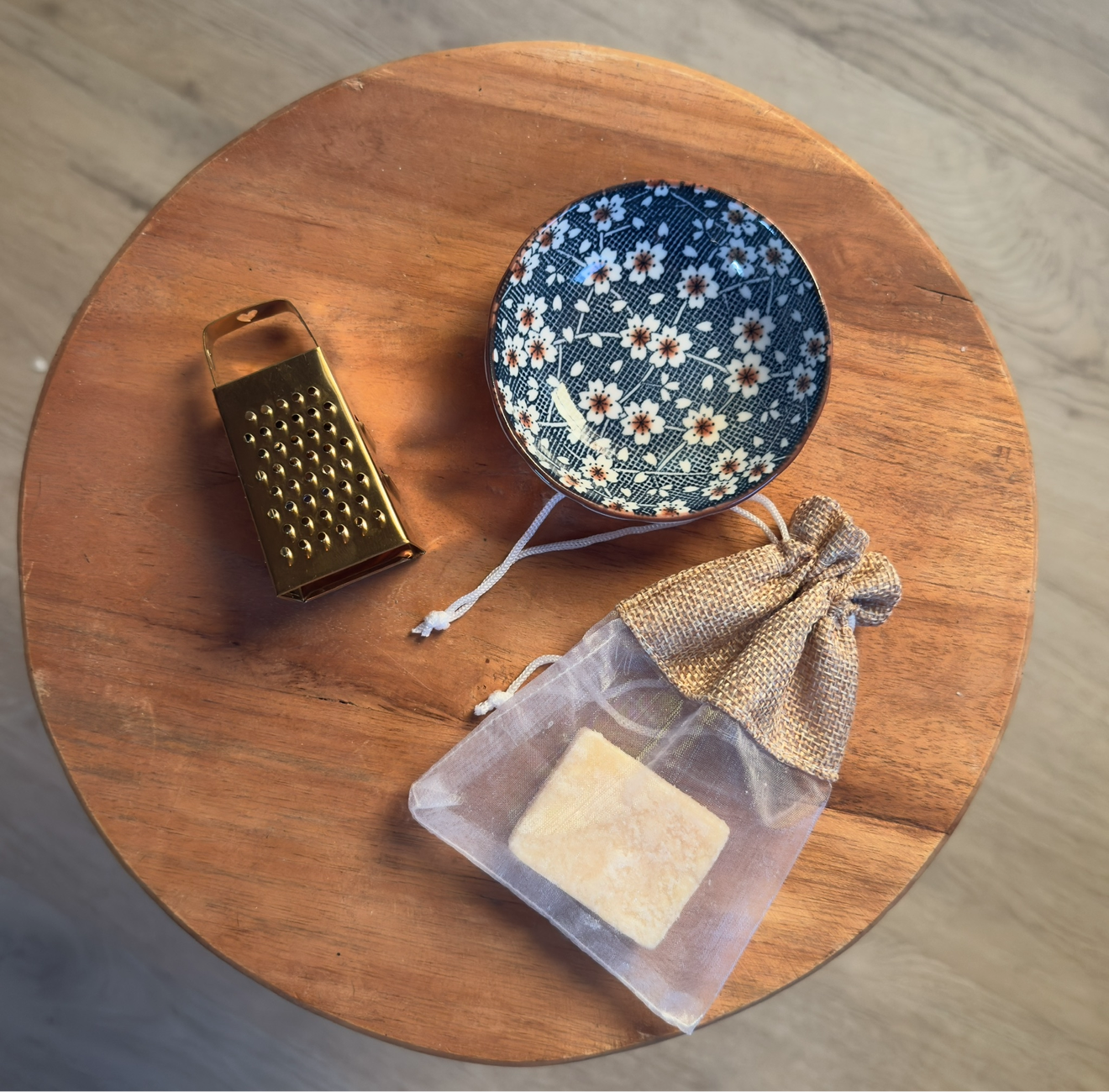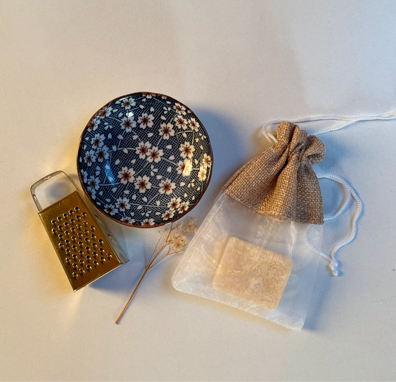 Deze set bevat een geurblokje, een elegant schaaltje en een fijne rasp, waarmee je de heerlijke geur telkens opnieuw kunt verfrissen.
